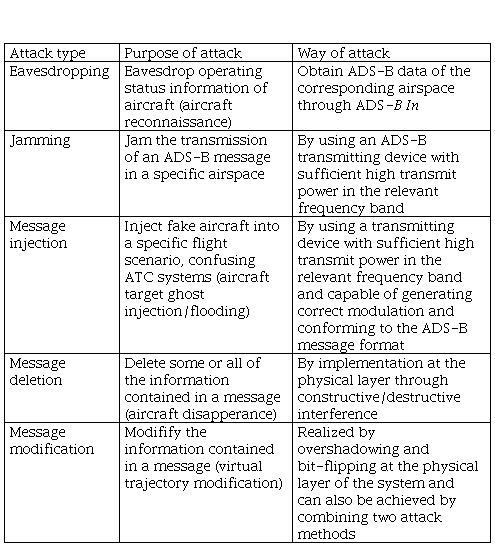 Attacks on the ADS-B, which can have different levels of impact on aircraft systems, include eavesdropping, jamming, message insertion, message deletion, and message modification (Table 1) (Wang et al, 2020).