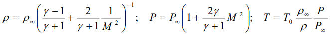 When a spacecraft descends from the orbit, a shock wave begins to form at an altitude of approx. 80 km. As the altitude decreases, the velocity increases slightly, reaching a maximum at an altitude of 40 km. The change in flight velocity with altitude for the descending Soyuz series spacecraft is given in Table 1. Flight velocities are much higher than the velocity of sound. In this case, the density, pressure, and temperature of the gas in the shock wave can be determined by the formulas (Gretchikhin et al, 2012).