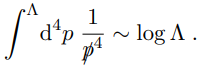 During the development of quantum electrodynamics (QED) it was discovered that many integrals were divergent (Dirac, 1927), (Dirac, 1934), (Heisenberg, 1934). Those were present in perturbative calculations involving Feynman diagrams (Feynman, 1949a), (Feynman, 1949b) containing closed loops. Particles circulating in closed loops are called virtual particles because they are off–shell, that is . In a loop, their momentum and energy are not determined and thus they have to be integrated over all values allowed by the whole 4–momentum conservation. Such integrals are divergent, i.e. give infinite results. Divergencies that are troublesome in quantum field theory are almost always due to large energy and momenta i.e. ultraviolet divergencies – (UV), or conversely short distance behaviour.