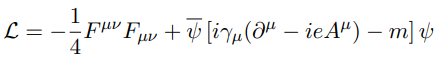 where Fµν = ∂µAν − ∂νAµ, ψ is a 4 component Dirac spinor and e the electric charge. Recall that under a gauge transformation is invariant for ψ → eiαψ and Aµ → Aµ + ∂µα.