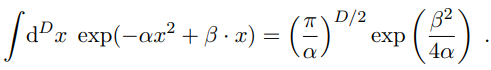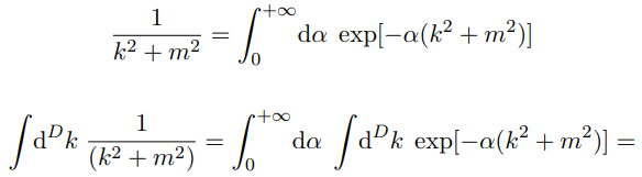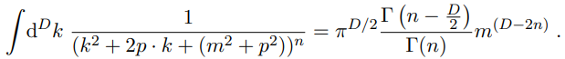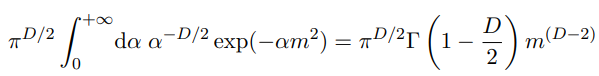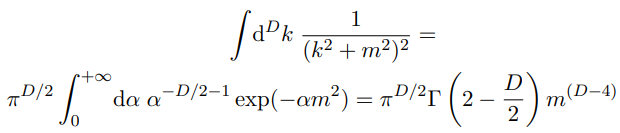 In order to perform the calculation, we will make use of the so–called dimensional regularisation (Bollini, 1972), (Hooft, 1972). This technique was introduced during investigation of the renormalisation of non Abelian gauge fields. It consists of writing Euclidean Feynman integrals obtained by means of a Wick rotation (Wick, 1954) x0 → ix0 (i.e. with positive defined metric ) in a space with generic dimension D, and making an analytic continuation in D itself which assumes non–integer values. Recalling that the volume of a D dimensional sphere SD is