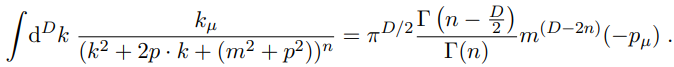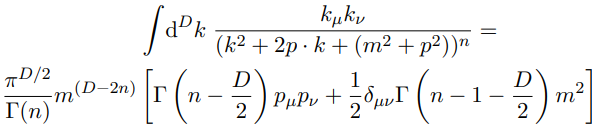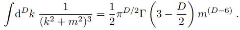 Integrating over the loop with the aid of eqs. (67) and (69) shows that the first two terms cancel out. Defining ε = (4 − D)/2, the integral reads