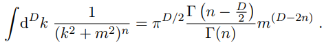 A few remarks on formula (22) are in order. First of all, we have actually checked out that thanks to dimensional regularisation and because of the Gamma function properties of its singularities, the loop integral has only a divergence given by a simple pole for D → 4, all other terms being finite. The technique used when D approaches 4 is known by the name “epsilon expansion” (Wilson and Kogut, 1974), very often employed in Statistical Mechanics as well.