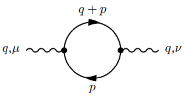 The first loop diagram of QED we consider is the so–called vacuum polarisation diagram, i.e. the correction to the photon line, shown in Fig. 1.