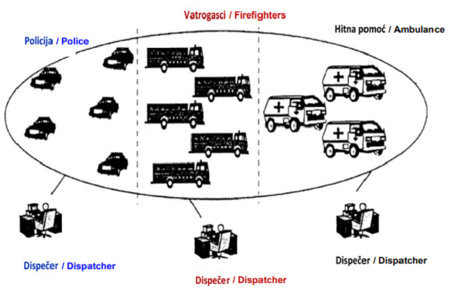 Figure 8 shows the simultaneous use of a single TETRA network for three groups of different users (police, ambulance, and firefighters). Such a unique TETRA radio network is designed as a standard to support the simultaneous work of very demanding and specific groups of users in the field of public safety and security, as well as emergency services (see the figure), and transport organizations, service organizations, and industry, local government and various services, and of course, (in specific circumstances) the military.