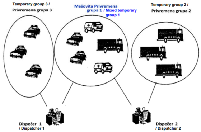 All Dispatchers from different Virtual Networks can communicate with each other and, in case of special critical or accidental situations (major traffic accidents, fires, natural disasters), form special Temporary Functional Groups (composed of participants from their own network user groups), as well as Mixed functional groups (composed of participants from different network groups of users), depending on the given accident situation and defined tasks (Figure 10). At the same time, the participants of such new groups have the opportunity to, with the permission of the Dispatcher, change the membership of the group if necessary, so like the Dispatchers, they can belong and communicate with more groups. The work of the entire Virtual Network is usually managed by one Dispatcher, although the network (for some groups of participants) can work without the Dispatcher. From its DWS, that Dispatcher has an overview of the current position of each member of the group (knows the radio cell in which it is located) and its status. Also, he has an insight into every communication between the participants and can break into it, to convey a message, to interrupt it or to insert a new interlocutor. By listening to ambient noise, especially in Public security services (even in the Military), the Dispatcher can monitor the work of individuals in cars or in the field without their active participation. Multiple levels of identification and verification, as well as strict control of access and communication in the network by the Dispatcher, guarantee that only authorized users can use the system. In case of theft of a mobile radio device, the Dispatcher can remotely disable any further operation of that terminal (temporarily or permanently), as well as monitor its movement through the network.
