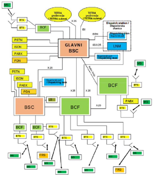 Due to the advantages of Digital Trunking Mobile Radio Communications Systems using the TETRA standard in relation to the Systems of analog trunking of mobile radio communications, they are today almost exclusively used for the construction of UHF systems of digital mobile radio communications of functional users. The construction and operation of these systems is defined by the basic package of TETRA 1 specifications, adopted by ETSI in late 1995 and subsequently amended in late 1977. They define all infrastructure equipment (BTS, BCF, BFC), Local Network Management-LNM and Centralized Network Management-CNM equipment and Participating Equipment (MS and LT), as well as all interfaces applied in the system. Also, they define: group, broadband and emergency calls, then fast system access (<300 ms), TMO and DMO types of work, different levels of application of system access protection (Autentification) and information encryption, work by telephony with participants in the networks of functional PABX and public PSTN networks (including full duplex), as well as support for the smooth operation of control points .Control and Dispatch Centers), and integrated data transmission by circuit switching and independent packet data transmission by TETRA PDO. The Radio interface for TMO and DMO operating mode (according to TDMA organized) is specified in detail, both for integrated speech and data transmission.TETRA V + D, and for independent optimized packet mode of data signal transmission.TETRA PDO. Regarding the improvement of data transmission and modernization of the system to TETRA 2-TEDS, by ETSI TC (Technical Committee TETRA) and TCCE (TETRA Critical Communications Evolution), these specifications were adequately amended in 2006, and continue to be permanently revised.