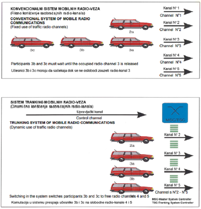 Mobile radio communication trunking systems, both analog and digital, are in fact UHF (Ultra High Frequency) mobile radio communication systems that automatically switch the available communication radio channels of Base Radio Stations (BRSt) for the interconnection of mobile participants as well as for the connection of mobile participants with other participants. One of these communication radio channels must be used as a Control Channel. Through this channel, calls are registered by mobile and other participants, status messages are transmitted and the order of connection requests is assigned. Namely, as soon as the request for establishing a connection arrives, one of free communication radio channels (channels from the capacity of the respective BRSt, in whose service zone the participant who sent the connection request is assigned) is assigned to the participants for exclusive use to occupy that channel for communication with each other. In cases when, during the established connection, new calls for establishing connections via the same BRSt arrive on the system, they are assigned the remaining ones and not the occupied communication radio channels for the connection, until the full utilization of the communication radio channels on the respective BRSt. If all channels are busy, a queue is formed for new connection requests (these requests are queued). As soon as one of the busy communication radio channels is vacated, the system assigns it to the first participant from the formed waiting list. This means that in the trunking system of mobile radio communications, the call for connection is sent only once because, in case of impossibility for current connection, the call will be placed on the waiting list and will be processed later in the order and priority that the participant has (Ovchinnikov et al, 2000), (Svrzić & Ćosović, 2000), (Svrzić & Ćosović, 2002b). An important difference in the functioning of conventional from trunking systems of mobile radio communications is plastically shown in Figure 1.