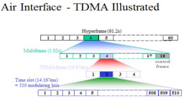 In the TETRA 1 standard, according to the hierarchy, it is defined that announcements are submitted in TDM multiframes, with a duration of 1.02 s. By grouping 60 TDM multi frames, one TDM hyperframe is obtained. Each TDM multi-frame contains 18 TDM primary frames, of which the 18th is the Control Frame, i.e. the SACCH (Slow Associated Control Channel), through which signaling is always transmitted, even if all other channels occupied as working channels.