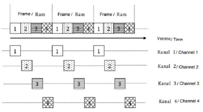 Each TDM primary frame has a duration of 56.67 ms and contains 4 time intervals of 14.167 ms. In each of these time intervals, the information of one time (communication) channel is transmitted, within its duration of 14.167 ms, by placing in the channel a channel packet of a total length of 510 bits, out of which 432 are information while the rest are "official bits". This means that within 1s, 35,999.152 bits are transmitted for all 4 communication-traffic channels, i.e. that the channel speed of the signal in one communication radio channel = 9 kb/s (Figure 5). (Ovchinnikov et al, 2000), (Svrzić & Ćosović, 2002b), (123seminarsonly, 2004), (Svrzić 2021)