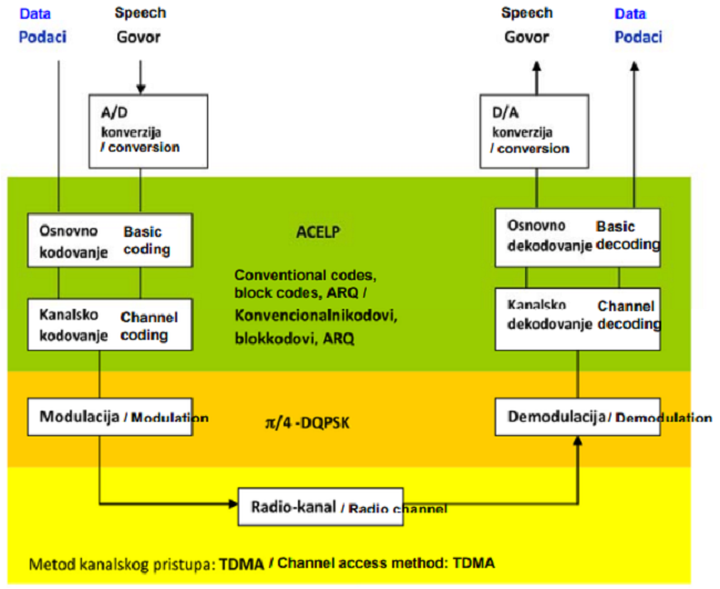 After A/D conversion, speech is transmitted at a bit rate of 4.8 kb/s and encoded with a special "codec" which applies the ACELP algorithm .Adaptive Code Excited Linear Predictive) which then ensures high quality of the transmitted speech signal. The TETRA 1 system also transmits data signals as standard with circuit switching and packet switching. Digital data comes directly, and speech after A/D conversion, to the ACELP speech codec in which they are first subjected to a protocol: basic and then channel coding ("block" and "symbolic. coding, sequence shifting and scrambling), after which interference-resistant information is formed in communication radio channels, which is further modulated by applying /4–DQPSK, RF amplified and transmitted to the air. During reception, reverse processes take place: demodulation of RF signals, channel and basic decoding, and for speech signals, D/ A conversion (again, Figure 7). (Ovchinnikov et al, 2000), (Svrzić & Ćosović, 2002b)