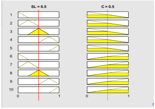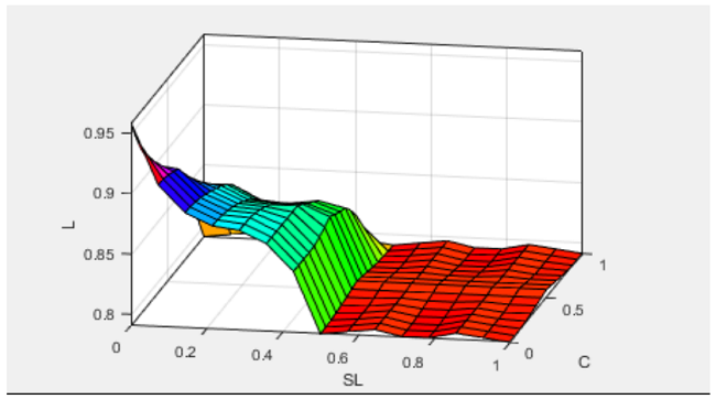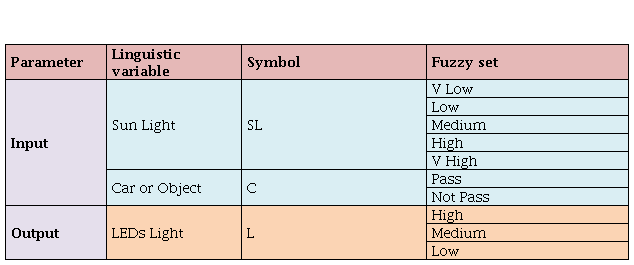 Table 2 represents the inputs (Sun Light SL and Cars or Object C) and the output (LEDs light) linguistic variables for the system.