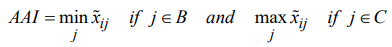 The anti-ideal solution (AAI) represents the worst alternative while the ideal solution (AI) represents the alternative with the best feature, and they are obtained by applying expressions (16) and (17):