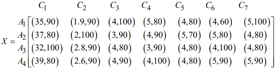 where the element of the set X, for example (35,90), represents the following: 35 is the value of the criterion C1 for the alternative А. defined by the decision maker (the width of the obstacle of 35 meters), and 90 is the degree of confidence (the decision maker is 90% sure that the value of the criterion C. for the alternative A1 (35) is correct).