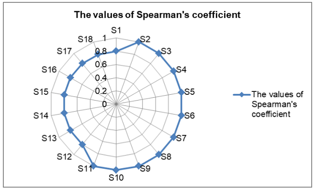 By applying the above scenarios in the proposed model, the correlation of ranks is obtained, i.e.. the relationship between the initial rank and the ranks obtained by applying the given scenarios, presented in Figure 3: