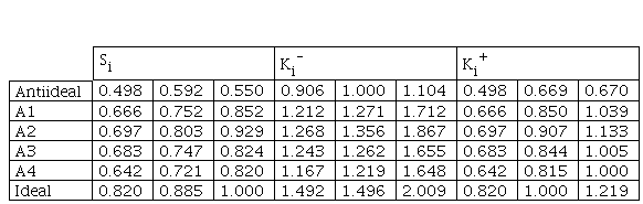 Using expressions (21) and (22), the degrees of utility of the alternative in relation to the anti-ideal and ideal solutions are obtained.