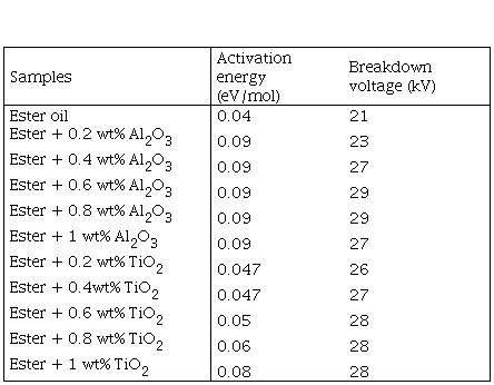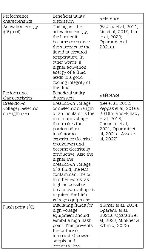 Oparanti et al (2021a) developed nanofluids and examined their activation energy and breakdown voltage. However, the analysis did not reflect conclusively which oil sample is the best candidate for high voltage equipment. Table 3 shows the oil samples and their corresponding activation energies and breakdown voltages.