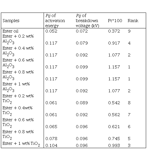 The data presented in Table 3 was analyzed using the beneficial utility index as the higher-the-better characteristics desired for high voltage equipment. The resulting analysis is displayed in Table 4. The multi-objective optimization shows that two oil samples exhibited the best performance - the nanofluids with 0.6 and 0.8 wt% Al2O3 nanoparticles. However, to save costs and to reduce agglomeration of nanoparticles in the fluid, the nanofluid with 0.6 wt% Al2O3 is the most promising candidate for high voltage equipment. In addition, it is recommended to study the effect of Al2O3 nanoparticles using the 1wt% stepwise increase instead of the used 2wt% stepwise increase of activation energy and breakdown voltage of ester oil. This will show that perhaps 0.7 wt% has better activation energy and breakdown voltage.