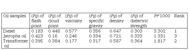 The flash point and dielectric strength were analyzed using the beneficial utility index (see Table 1) while the rest of the characteristics in Table 5 were analyzed using the unbeneficial utility index (see Table 2). The result showed that the developed Jatropha oil exhibited lesser performance for high voltage equipment compared to the other two standard oils. This means that further study is essential to improve the performance characteristics of Jatropha oil for high voltage equipment. Many reports have shown that the addition of nanoparticles and the improvement of oil production can improve the performance efficiency of the oil for high voltage equipment (Jin et al, 2014; Peppas et al, 2016a, 2016b; Rafiq et al, 2016; Muangpratoom & Pattanadech, 2018; Oparanti et al, 2022).