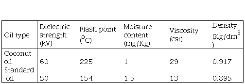 Abeysundara et al (2001) produced a coconut oil, evaluated its performance characteristics and compared it with a standard oil for high voltage equipment. The properties of the two different oil types are presented in Table 7.