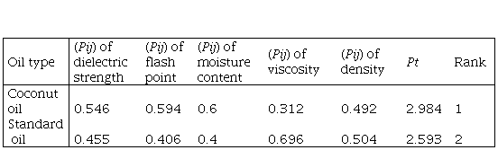 The multi-objective optimization analysis was done and presented in Table 8 based on the conditions in Table 1 and 2. It is interesting to note that the produced coconut oil exhibited a higher performance tendency for high voltage equipment compared to standard oil. This shows that it is a good candidate for high voltage engineering. Therefore, further study such as ageing, direct application of the oil in a typical high voltage equipment is recommended.