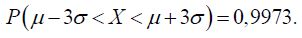 Chebyshev’s inequality gives only the upper limit of the probability of the given deviation. The probability for a random variable to assume the value outside the interval is in practice generally far smaller than 1/9. If the distribution law is not known, and only μ and σ are, the given interval is considered to be an interval of practically possible values of the random variable X. The statistic rule stating that for normal distribution it is necessary that all the values lie within the three standard deviations of the arithmetic mean is called three sigma or 68-95-99.7 rule. More precisely, 68.27% of the values lie within one standard deviation of the mean, 95.45% of the values lie within two standard deviations of the mean and 99.73% of the values lie within three standard deviations of the mean, which can be presented as: