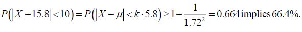 The conclusion that follows is that the probability of the number of cloudy days to deviate for January, for less than two deviations, equals at least 66%. It means that at least 66% of the realization of the random variable X is within the interval (5.8; 25.8).