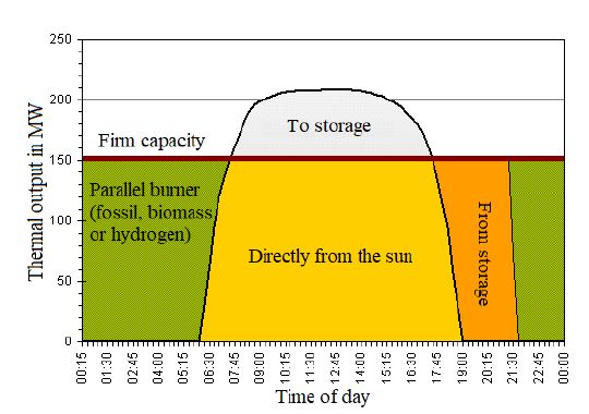 The efficiency of these plants increases with the installation of energy storing systems, which also contributes to their reliability. These systems rely on the storage of thermal energy into a material of high energy density. The heat storing systems collect the energy during sunny periods (Figure 4), and this energy is spent in the periods of low sun radiation or when there is not radiation at all.