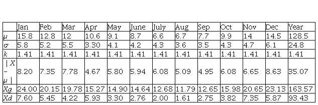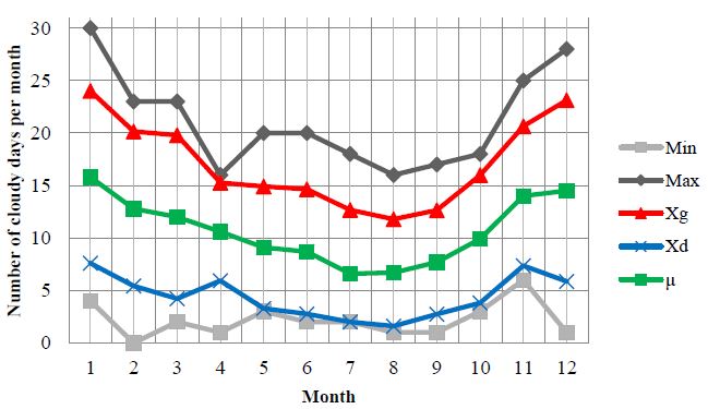 The upper limit (Xg) and the lower limit (Xd) of the number of cloudy days per month that varies from the middle - expected value, with a 50% probability, is shown in Table 2.
