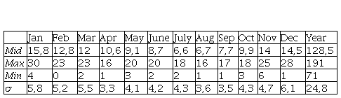 as well as based on the known expected values μ and the standard deviation σ, the probability of the number of cloudy days deviation from the mean value can be calculated. The minimum value of the number of cloudy days for January is 4, the maximum is 30 and the middle - expected value is μ =15.8 days. Taking into account the standard deviation σ = 5.8 and the deviation of 10 days, the result for January, as a critical month is as follows: