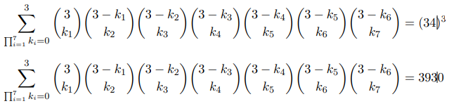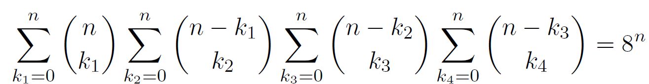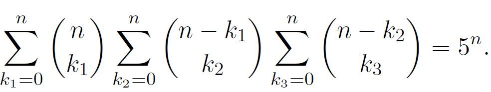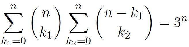 . The number of ways to paint the balls like this gives us the left-hand side. Alternatively, we can choose 3 colors for each ball to be painted with, white, yellow and blue, that is 3n . Therefore, we get