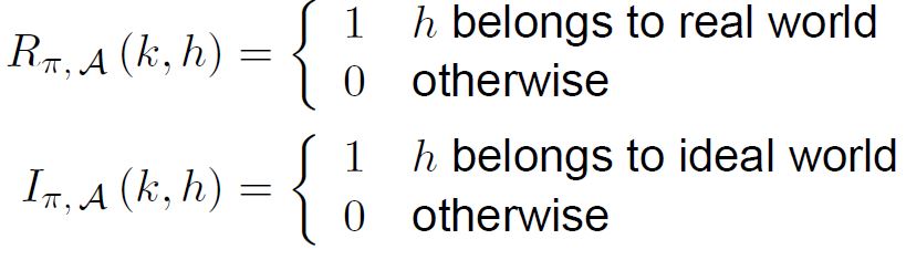 , the protocol execution his- tory by h and the security parameter by k. Since in an ideal environment, everything takes place in the right way, security threats and information leakage cannot be in it. Let us introduce the following two functions