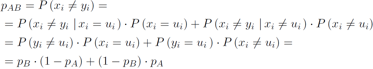 The relationship between Alice’s and Eve’s set of symbols is observed in the same way, and the probability of error in that binary symmetric channel is given by