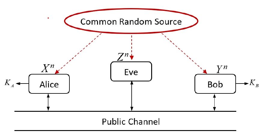 The basic model of the environment in which protocols of this type are defined and analyzed is given in (Maurer, 1993). According to the symbols common in the literature, the environment in which the protocol takes place is defined in the following way. Alice and Bob are actors who want to achieve mutual protected communication using a symmetric cryptographic algorithm, and for that they need a common secret key. Eve is curious and interested in the information that Alice and Bob exchange and she knows the protocol according to which they exchange messages and the cryptographic algorithm they will use. The only way Eve can access Alice and Bob’s information, provided the applied cryptographic algorithm is safe, is to somehow get their cryptographic key. It is assumed that Eve has an insight into all the messages that are exchanged during the protocol between Alice and Bob. Based on the information gathered, Eve tries to reconstruct the cryptographic key that Alice and Bob perform after the protocol is completed. The initial data, the strings of symbols, which are used in the execution of the protocol for establishing the cryptographic key Alice, Bob and Eve get in the following way. In a common source, a series of symbols is generated by some random process, denoted by , through independent binary symmetric channels of known characteristics are sent to Alice, Bob and Eve who register them as strings of symbols