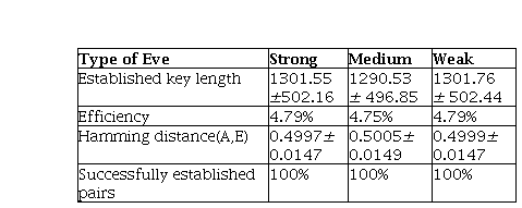 The table shows the results in relation to the assumed strength of Eve. The second row labeled Established key length shows the mean length value and the standard deviation of the established cryptographic keys lengths in the (76 75)/2 implemented protocols. The third row shows the efficiency of the applied protocols expressed as the ratio of the length of the obtained cryptographic keys and the length of the initially used string. At first glance, it seems that the efficiency is small and unsatisfactory, but the length obtained, on average over a thousand bits, is many times higher than the currently accepted standards for cryptographic key lengths of secure symmetric cryptographic algorithms. The fourth row shows the Hamming distance between the keys obtained by Alice and Eve at the end of the process, normalized by the length of the key obtained, and the table shows that this value is practically 0.5, which is a characteristic value for independent and randomly generated arrays. In the end, the table shows that the procedure was successful in all cases in which it was carried out. In addition, it should be noted that the obtained sets of cryptographic keys were tested by the NIST package to check the randomness of the data and all requirements were met.