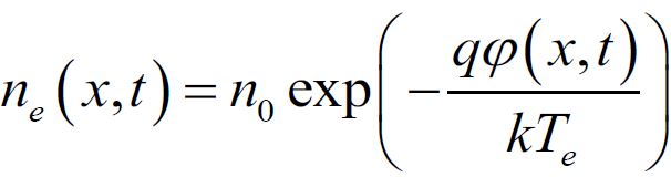 where – is the constant characteristic number density of ions. This assumption is not appropriate, since the electrostatic potential is non-stationary and the electron distribution function is different from a Boltzmann for a collisionless plasma. So, the total electron energy changes in time and the electron thermal energy becomes a source of the ion component acceleration in the expanding plasma. In a bounded collisionless plasma, the electrons are trapped and oscillate in a potential well, which is formed in order to satisfy a quasi-neutrality condition. Since the parameters of the potential well change during plasma expansion, so the variation of the electron energy becomes significant.