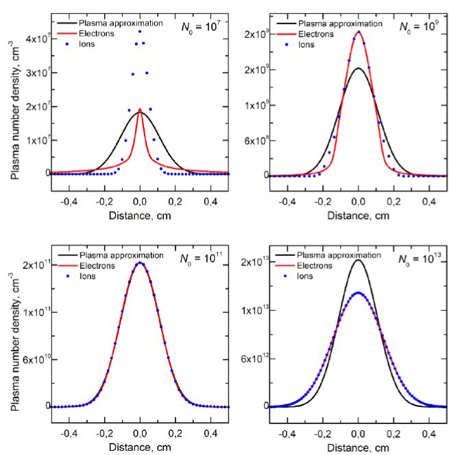 Figure 1 shows the comparisons of the number densities distributions of electrons and ions at a time point of ns for the cases of plasma expansion consisting of different initial number of particles. A quasi-neutral plasma distribution profile is shown with a black line in accordance with the analytical solution in the “plasma approximation” (Dorozhkina & Semenov,1998). The results of the numerical calculations (without the “plasma approximation”) - the number densities distribution profiles - are given for both electrons and ions to show the difference in their spatial distributions.