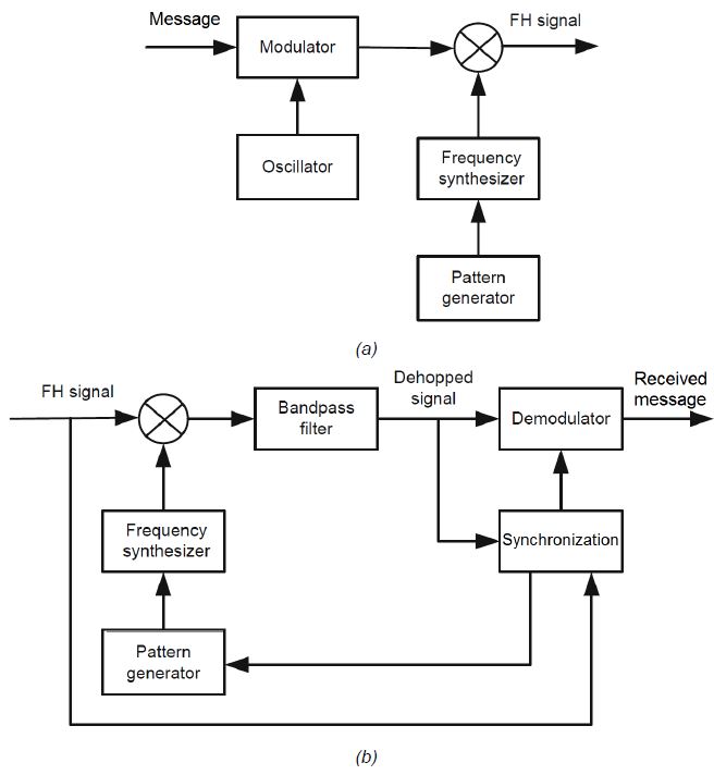 A block diagram of the transmitter and the receiver of a frequency hopping radio is given in Figure 1 (Torrieri, 2015). Figure 1 (a) shows a transmitter block diagram. The frequency hopping radio transmitter consists of a modulator, where some of the conventional digital modulations are applied. The modulated signal is further sent to the mixer where it is mixed with the carrier generated in the frequency synthesizer. The rule by which frequency hopping is performed is generated by the pattern generator. The pattern generator actually generates a pseudonoise sequence that defines which next frequency the frequency synthesizer should be set to.