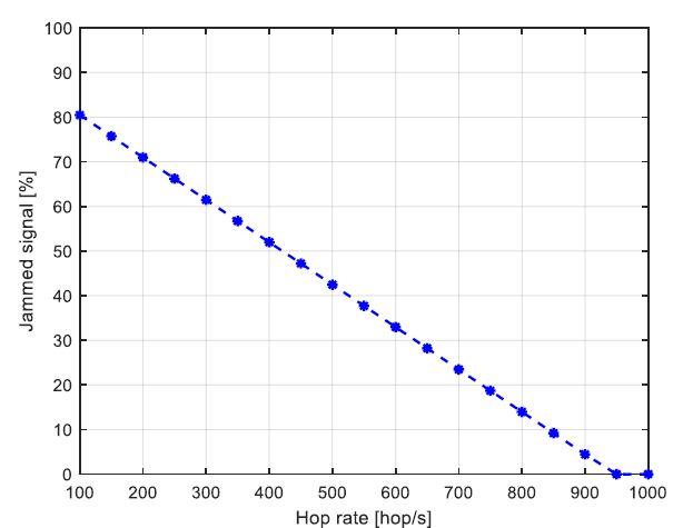 From Figure 6, it can be seen that over 80% of the hop duration is jammed when the hop rate is 100 hops/s. For higher frequency hopping rates, the percentage of jammed signals is lower. For example, for 900 hops/s, the jammed signal drops to around 4.5%.