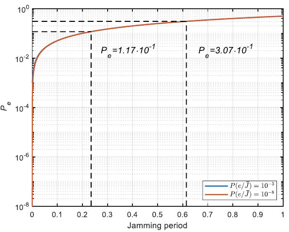 . It can be noticed that two curves almost coincide. This was actually expected because the values of error probability when there is no jamming slightly contribute to the overall error probability. For a more detailed view, Figure 5 (b) shows only 5% of the jamming period. From this Figure, one can see that these two curves are different for only 2% of the jamming period.