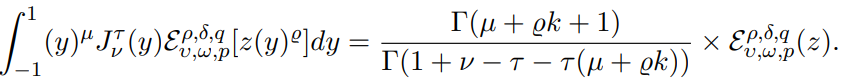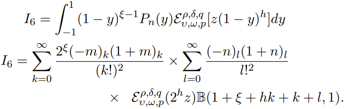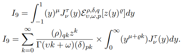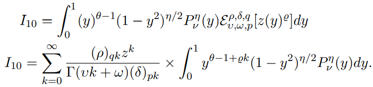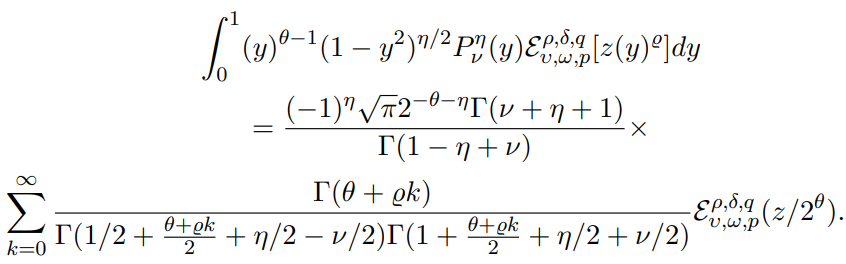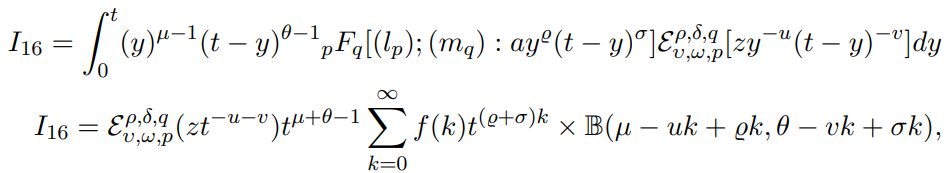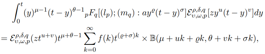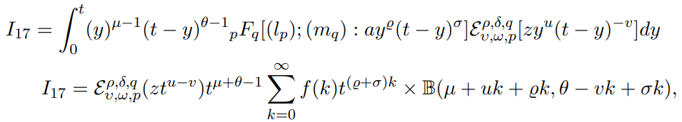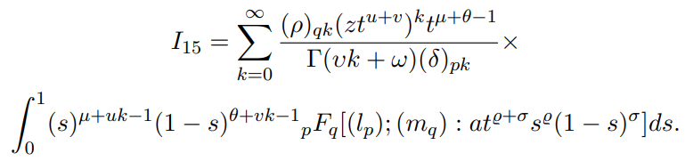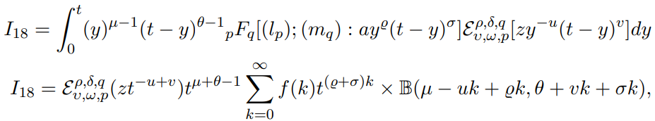 THEOREM 6. If p, q > 0 z, υ, ω, ρ, δ, ∈ C ,ℜ(υ) > 0, ℜ(ω) > 0, ℜ(ρ) > 0, ℜ(δ) > 0, ϱ − ϱτ > −1, ϱ > 0, 0 < τ < 1 and ℜ(µ + 1) > 0, then the following integral formula holds true.
