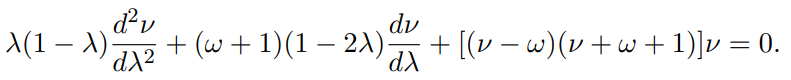 This is the Gauss hypergeometric type equation with a = ω − ν, b = ν + ω + 1, c = ω + 1.