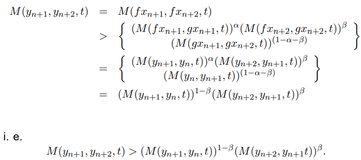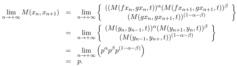 i. e. M(fz, z, t)(α+β) > 1 which is not possible as the left hand side is less than 1.Thus, fu = gu = u.
