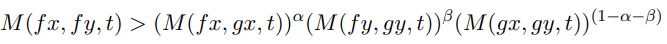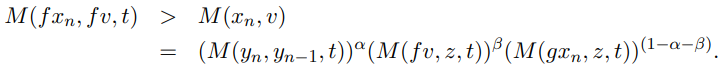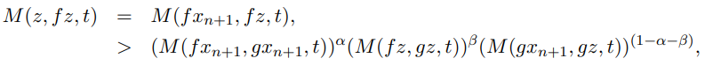 M(z, fv, t) ≥ [M(fv, z, t)]β i. e. M(fv, z, t)]1−β > 1, which is not possible if fv z. Hence fv = u and we have