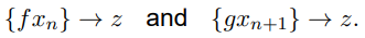 CASE I Suppose any two terms of the sequence {yn} are equal i. e. for some n ∈ N, yn = yn+1. As yn = fxn = gxn+1 = fxn+1 = gxn+2 = yn+1 we have fxn+1 = gxn+1. Let fxn+1 = gxn+1 = z. So xn+1 is a point of coincidence of the pair (f, g). As the pair (f, g) is weakly compatible we have fz = gz. Now we show that fz = z. Suppose, if possible on the contrary, that fz z so fz fxn+1. By using equation (3) we have
