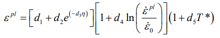 where d1, d2, d3, d4, and d5 are the material damage parameters and 0 is the reference strain rate. The damage in the material is defined by using a parameter D with a value between 0 and 1 where 0 means no damage and 1 means fully damaged material. Material failure occurs when D reaches a value of 1.