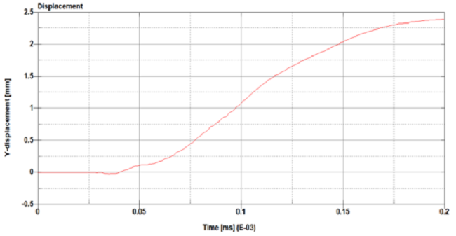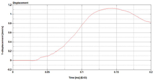 The displacement of the armor plate after the impact and semi-penetration is shown on the diagram in Figure 16. The first displacements occur after 0.03 ms. After 0.13 ms of the analysis, the maximum values of the displacements are achieved.