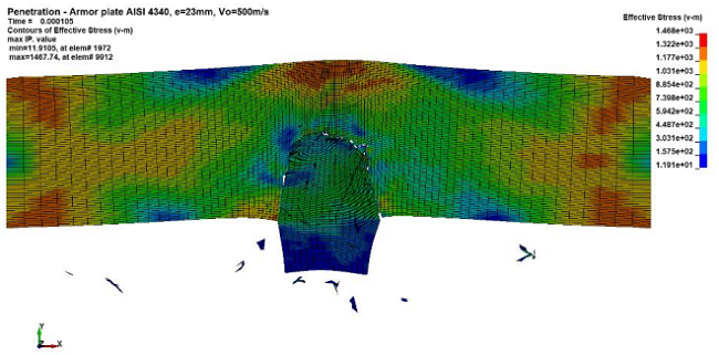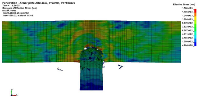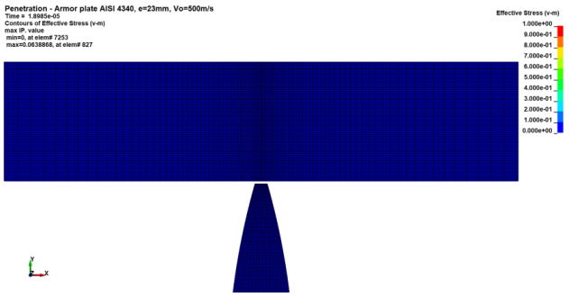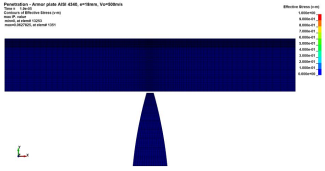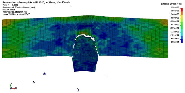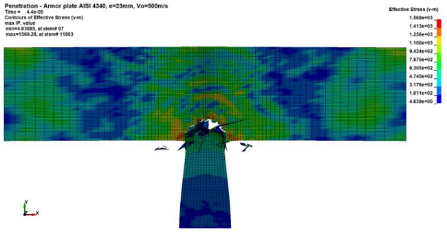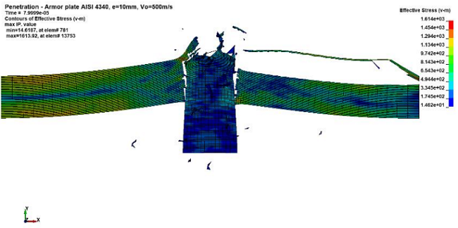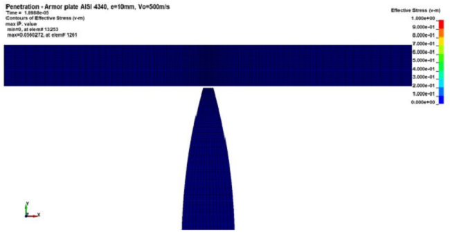 As it can be seen from the previous figures, for the case when the thickness of the armor plate is 23 mm, the perforation of the projectile does not occur.