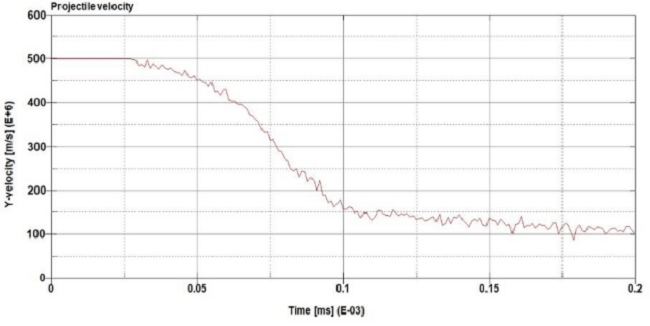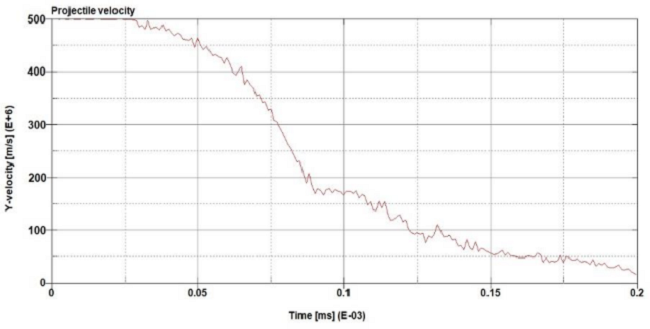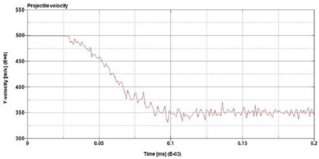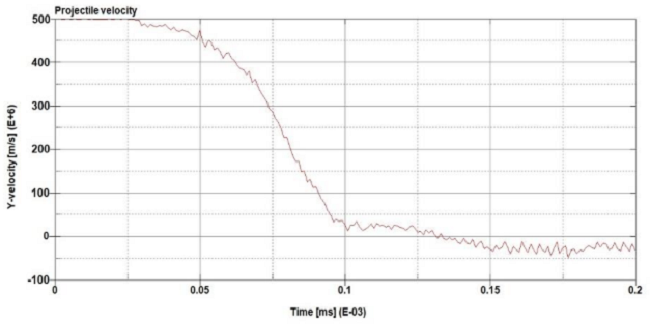 From the diagram in Figure 22, it can be seen that the limit perforation occurs after 0.03 ms. It can be noticed that the projectile velocity decreases between 0.03 ms and 0.1 ms, for the limit perforation required time. The velocity of projectile fragments after 0.1 ms is 140 m/s.