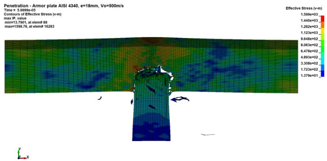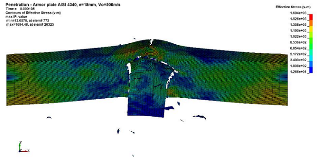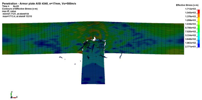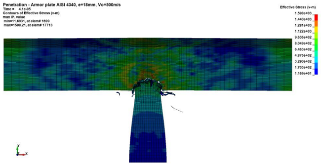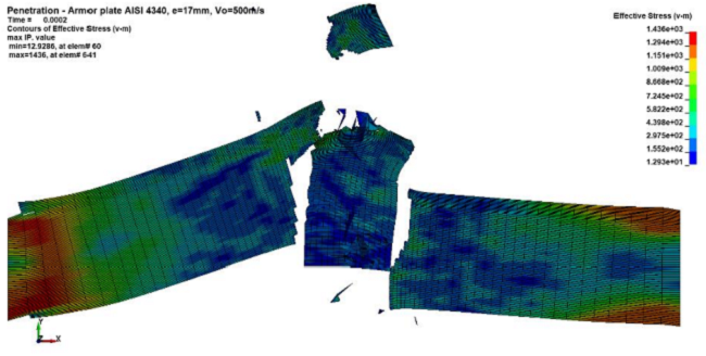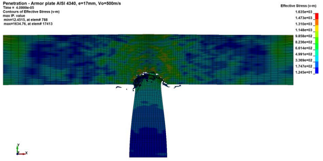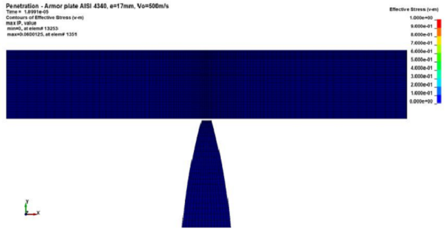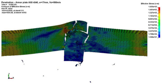 As it can be seen from the previous figures, for the case when the thickness of the armor plate is 17 mm, the penetration of the projectile occurs.
